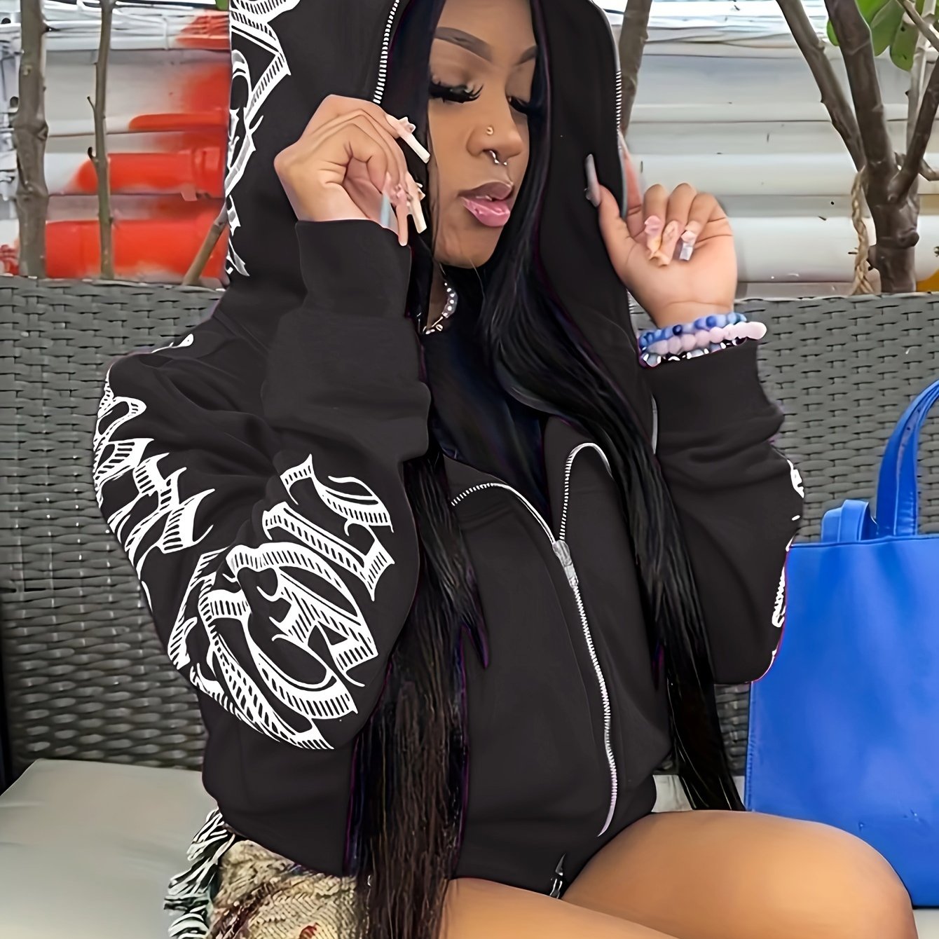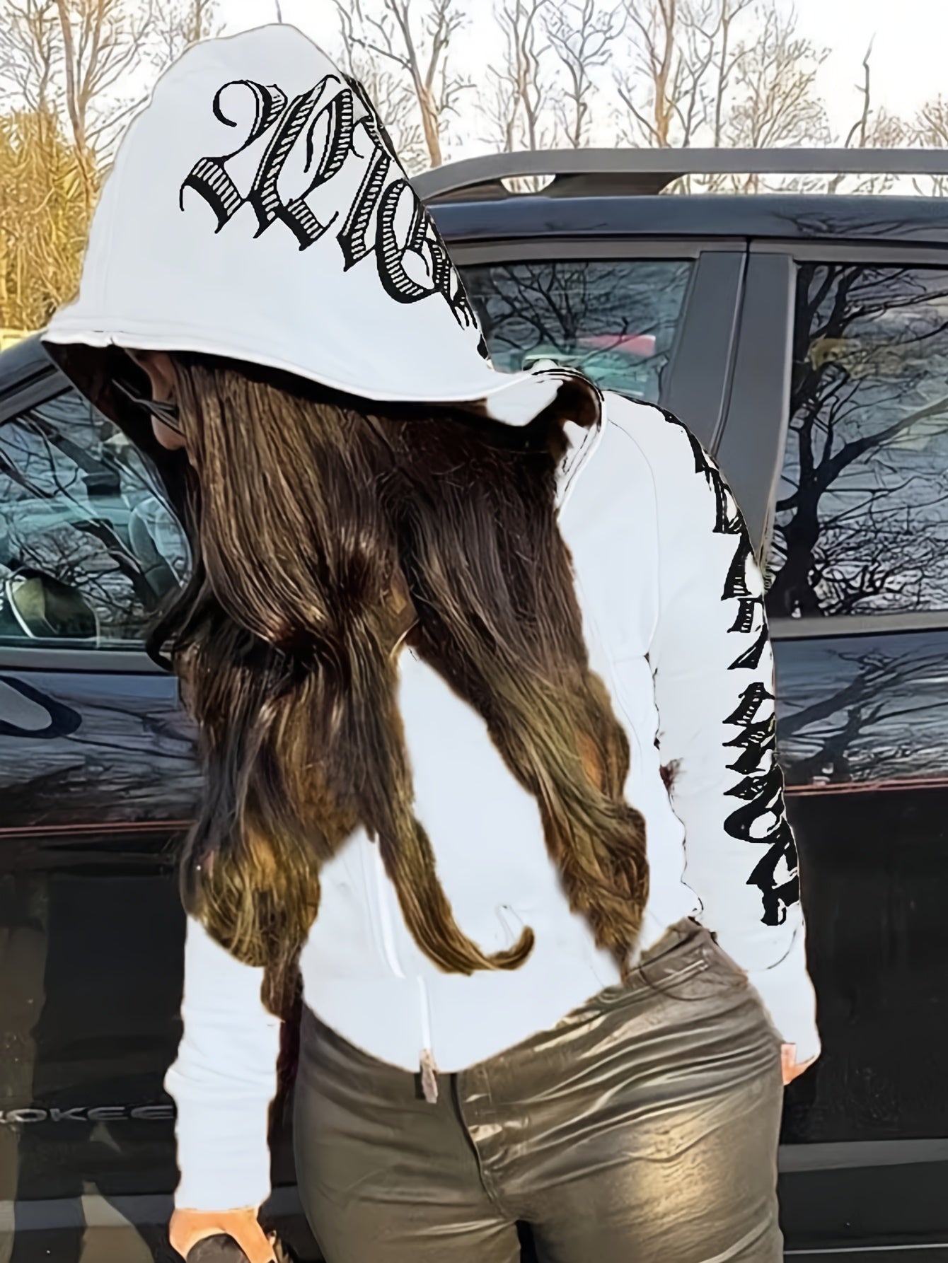 [Gothic Punk Hoodies] Cyber Y2K Gothic Punk Long Sleeve Zip Up Hoodies, Women's Letter Print Sweatshirt